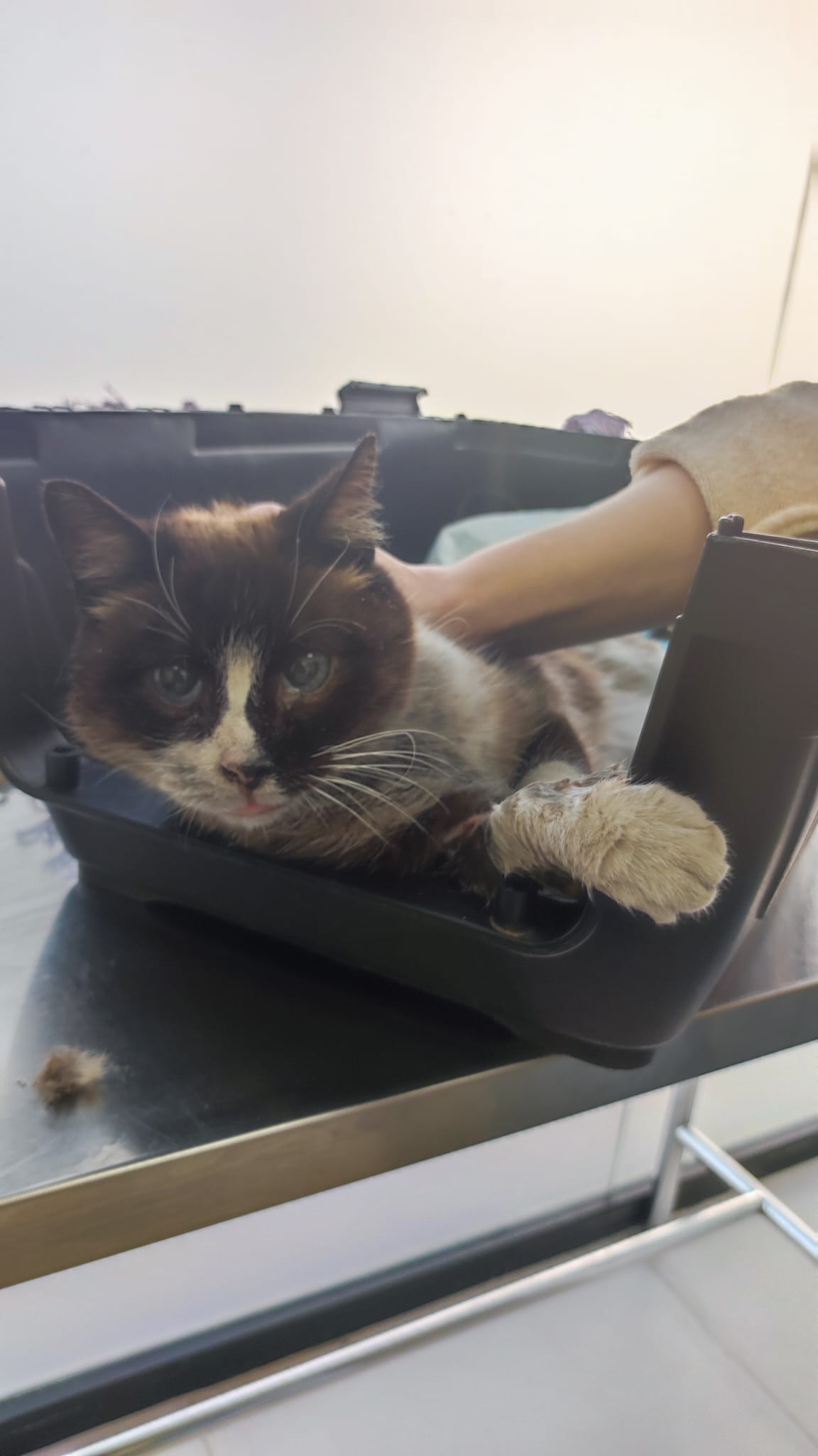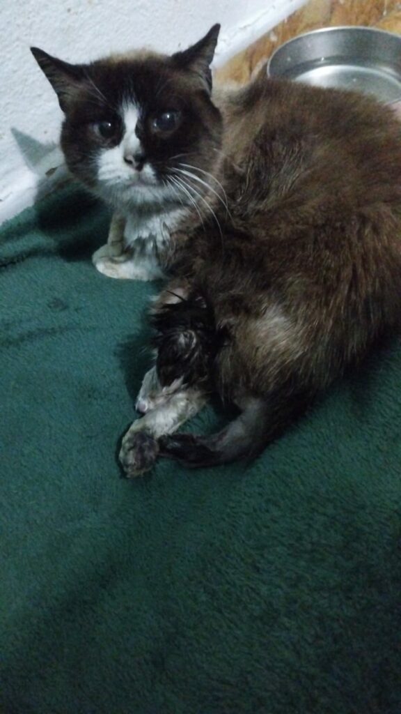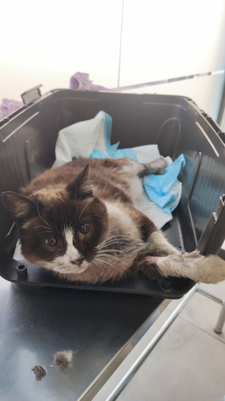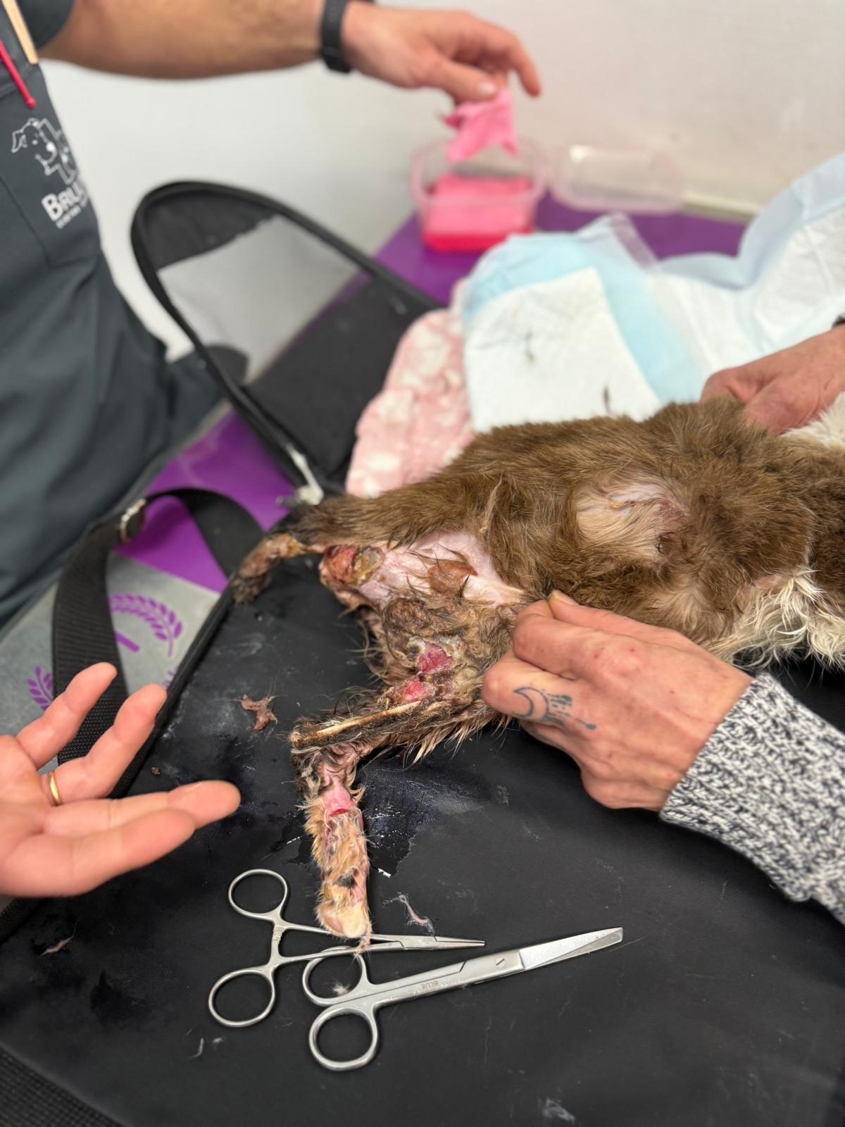 Kiedy do nas trafiła, było jasne, że to nie jest „mały uraz”. Rany na wszystkich kończynach. Jedna łapa w bardzo złym stanie. Ogon sparaliżowany – martwa tkanka wymaga amputacji. Silny stan zapalny, wyniszczenie, ból, który trwał zbyt długo, bez leczenia i bez przerwy.