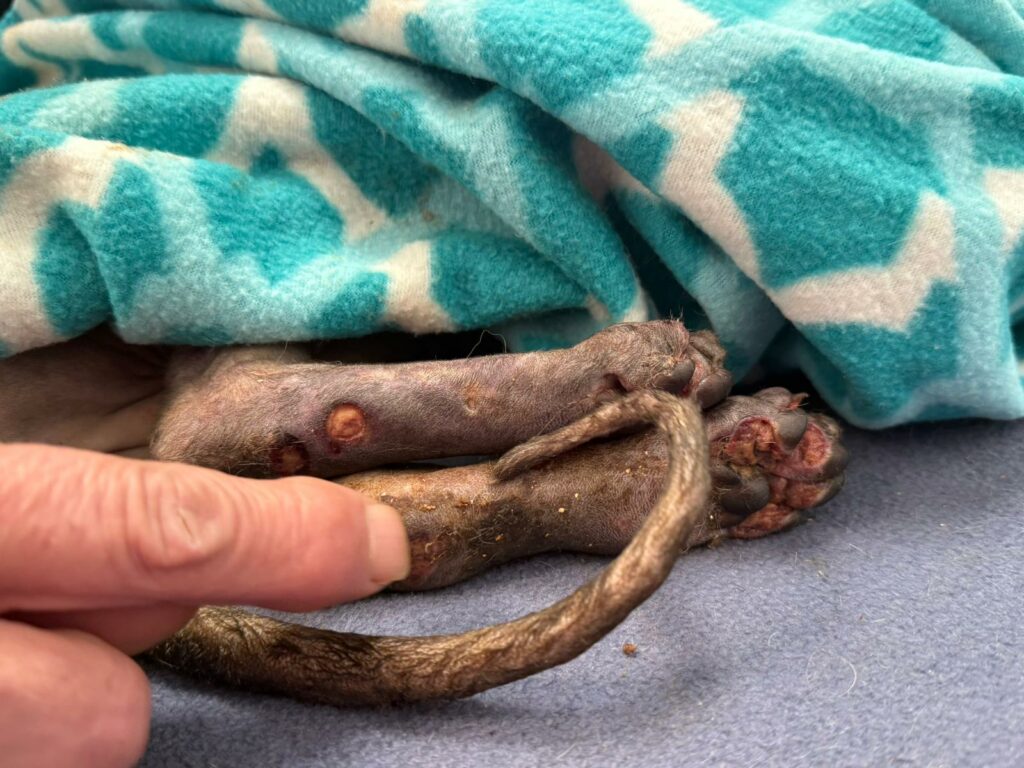 Został przyjęty na oddział zakaźny i objęty izolacją. Ma założony wenflon, otrzymuje intensywną płynoterapię, leki i stały nadzór. Lekarze zajmują się także leczeniem zmian na łapach, oczyszczaniem i terapią miejscową, aby zapobiec powikłaniom.