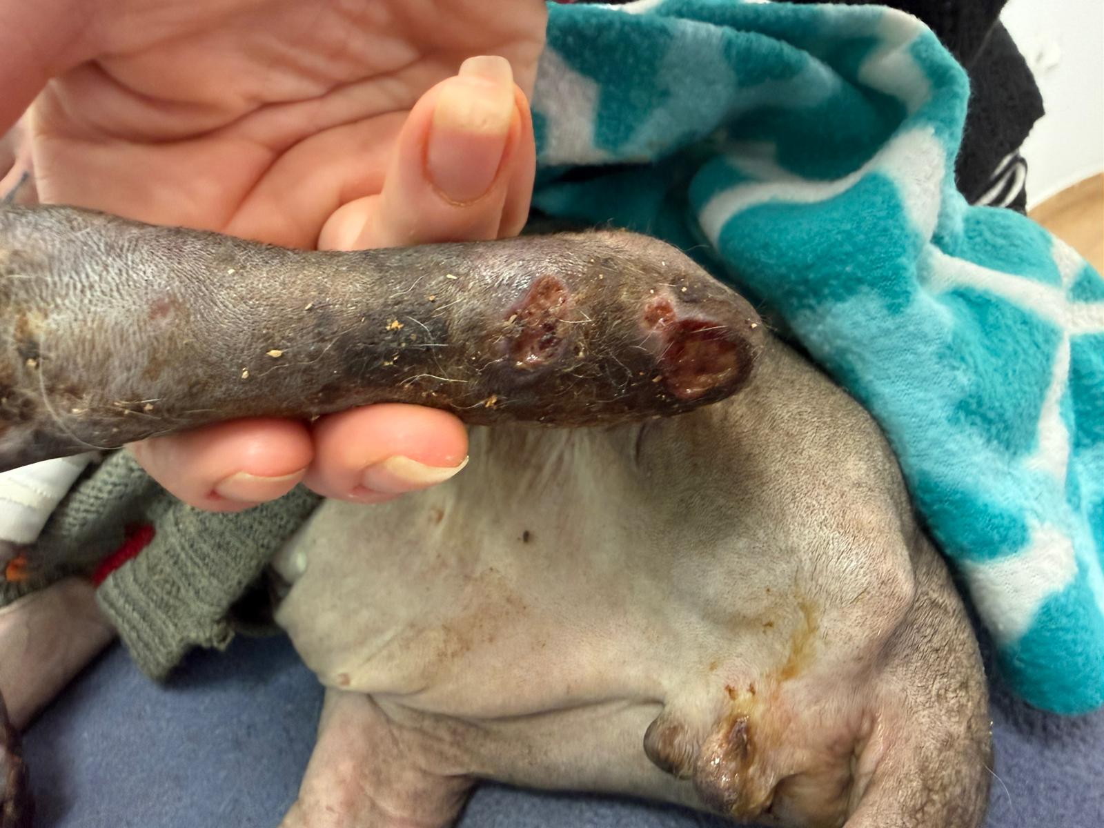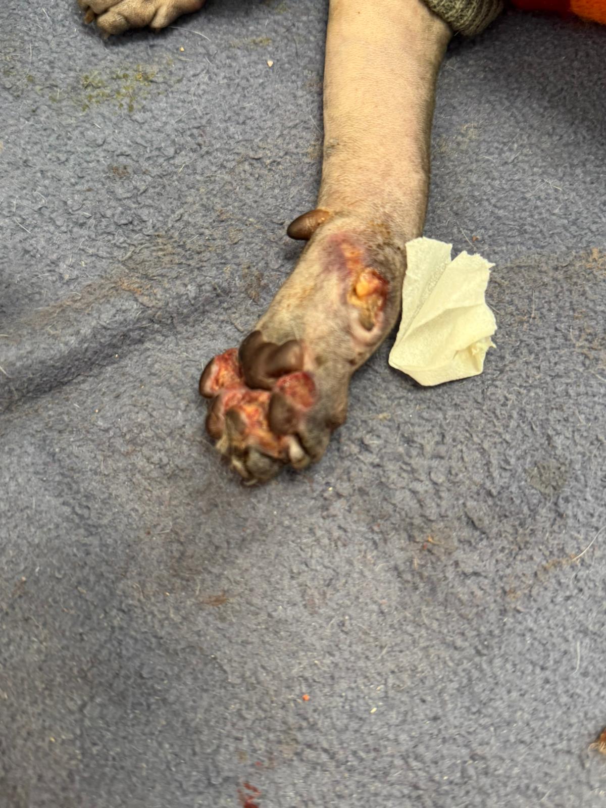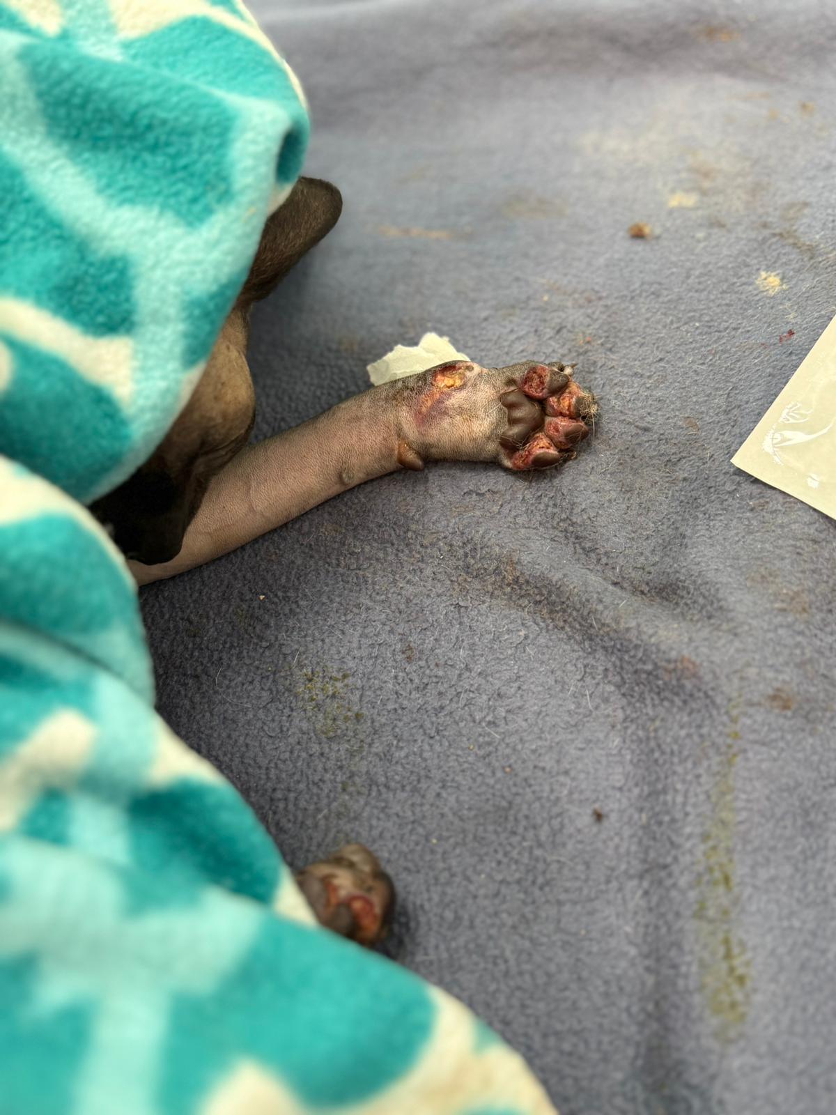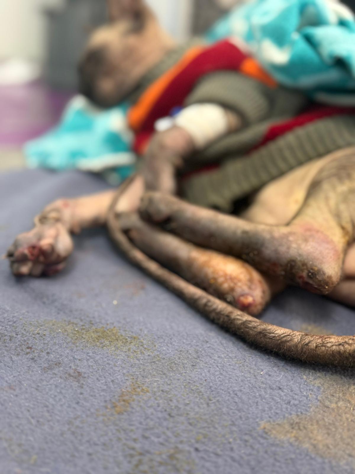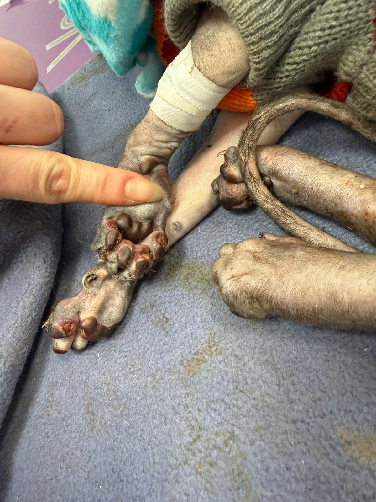 Został przyjęty na oddział zakaźny i objęty izolacją. Ma założony wenflon, otrzymuje intensywną płynoterapię, leki i stały nadzór. Lekarze zajmują się także leczeniem zmian na łapach, oczyszczaniem i terapią miejscową, aby zapobiec powikłaniom.