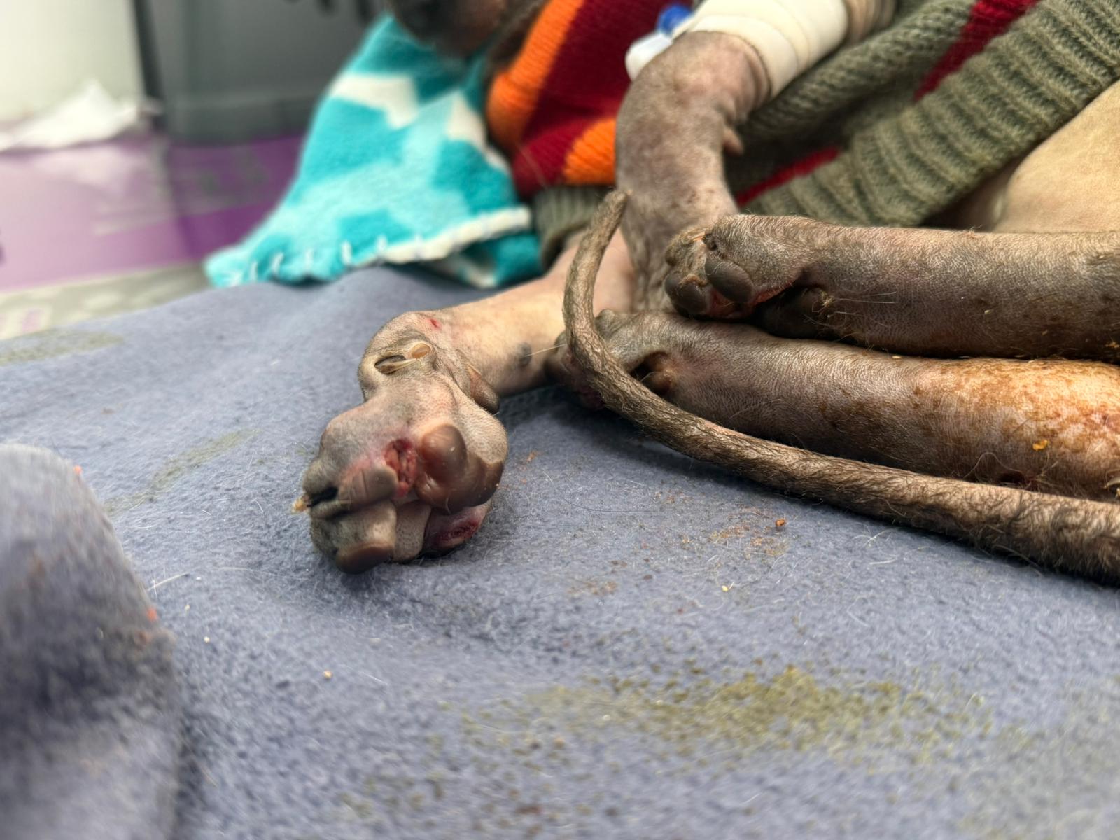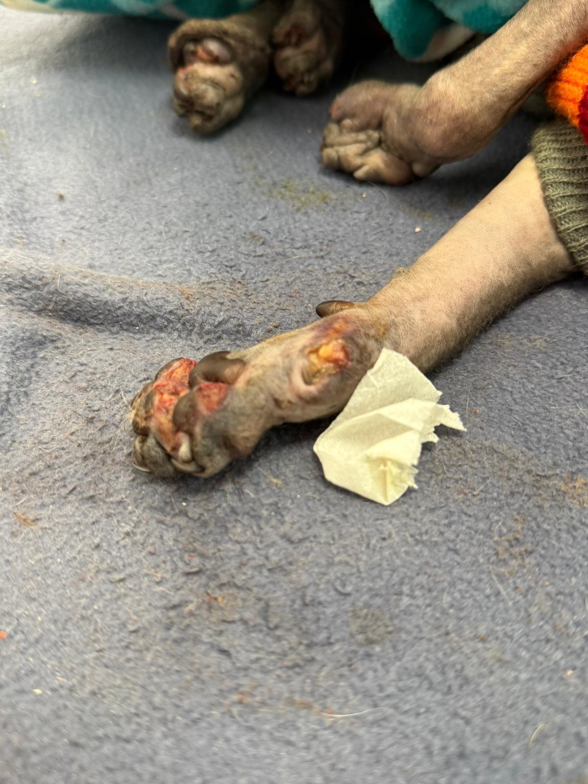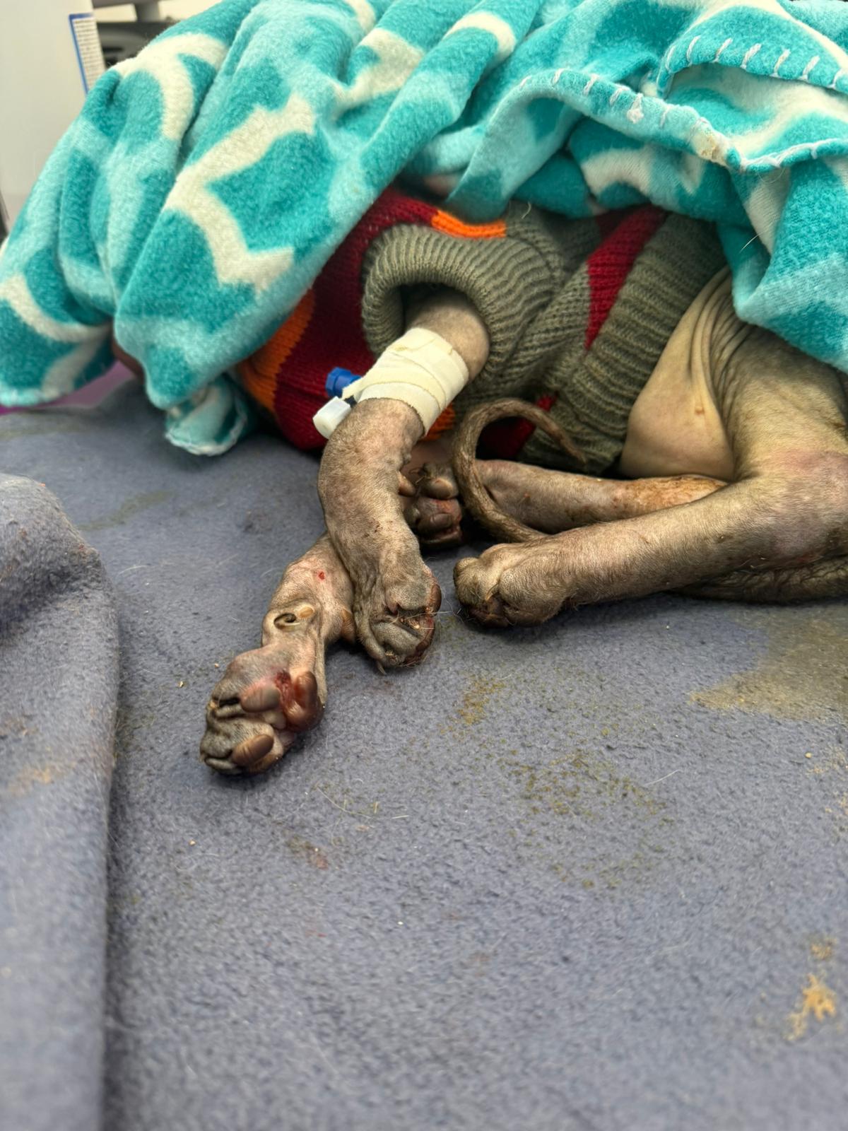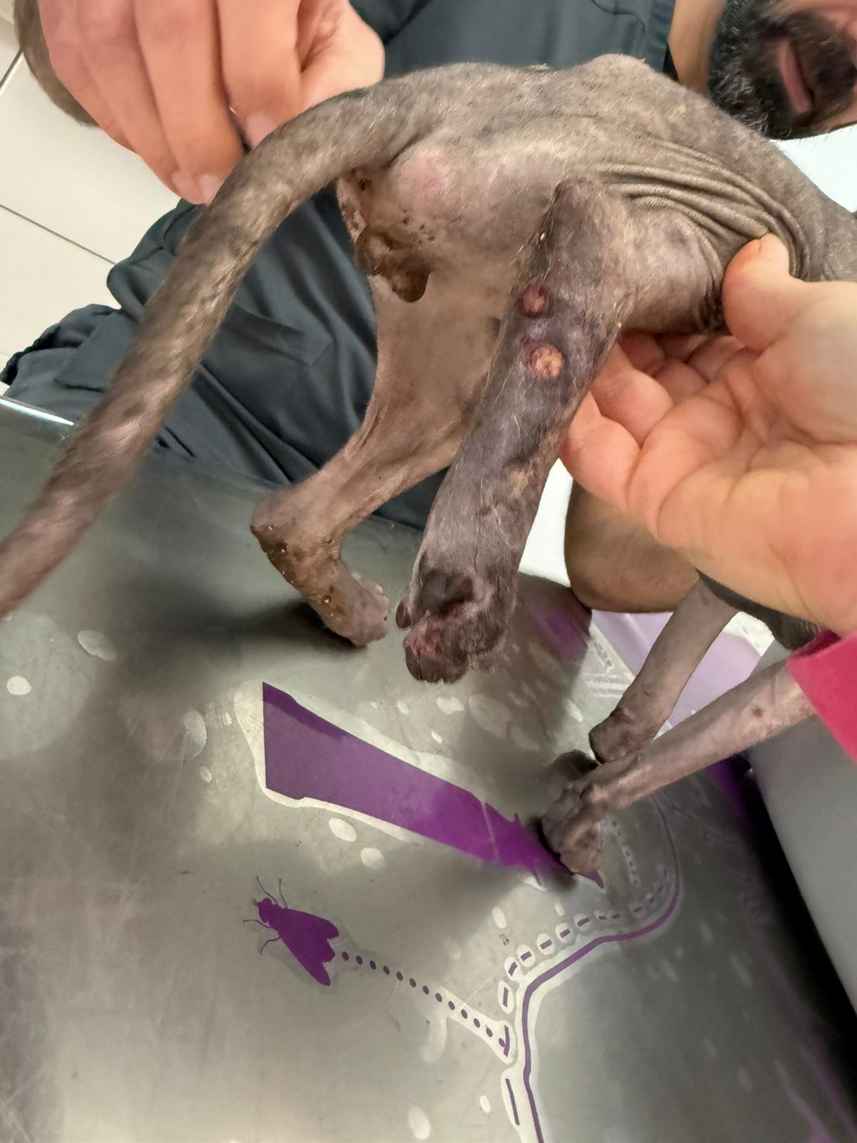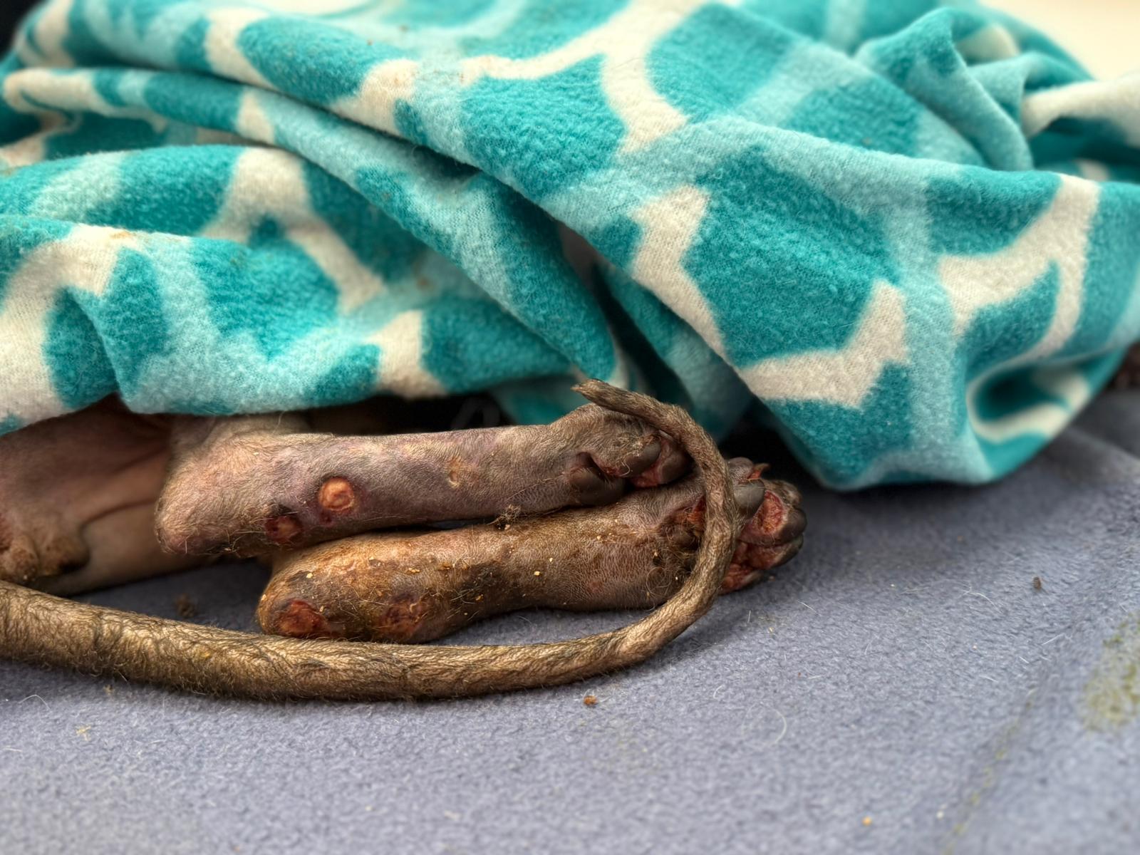 Został przyjęty na oddział zakaźny i objęty izolacją. Ma założony wenflon, otrzymuje intensywną płynoterapię, leki i stały nadzór. Lekarze zajmują się także leczeniem zmian na łapach, oczyszczaniem i terapią miejscową, aby zapobiec powikłaniom.
