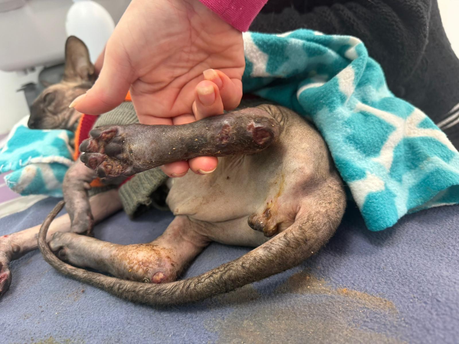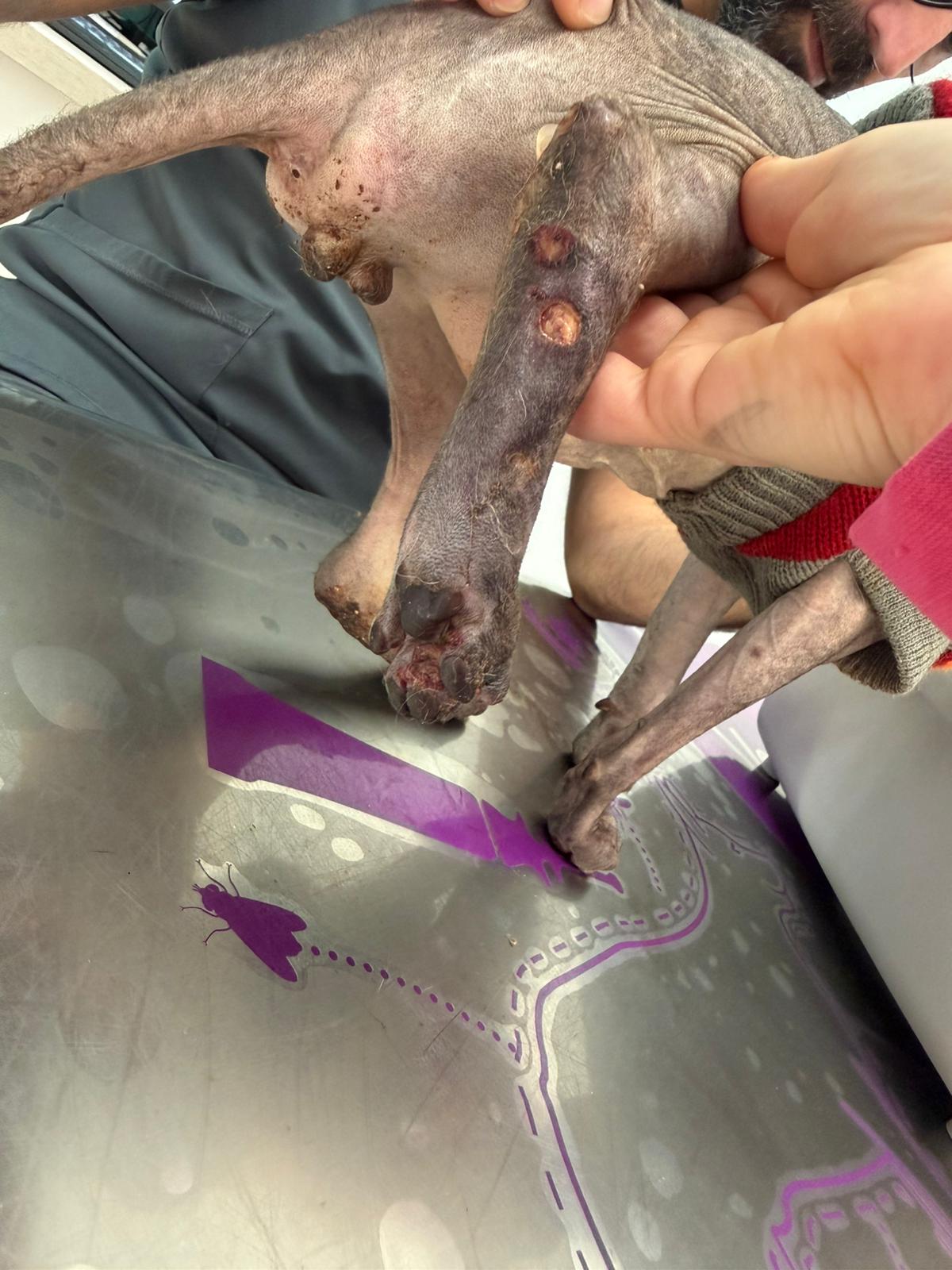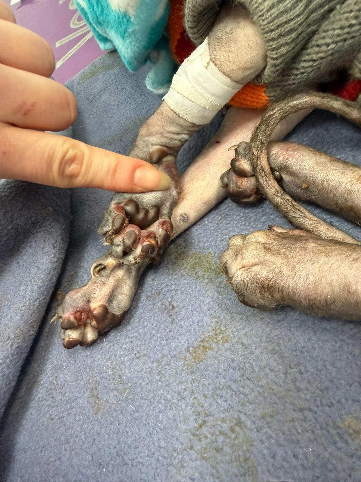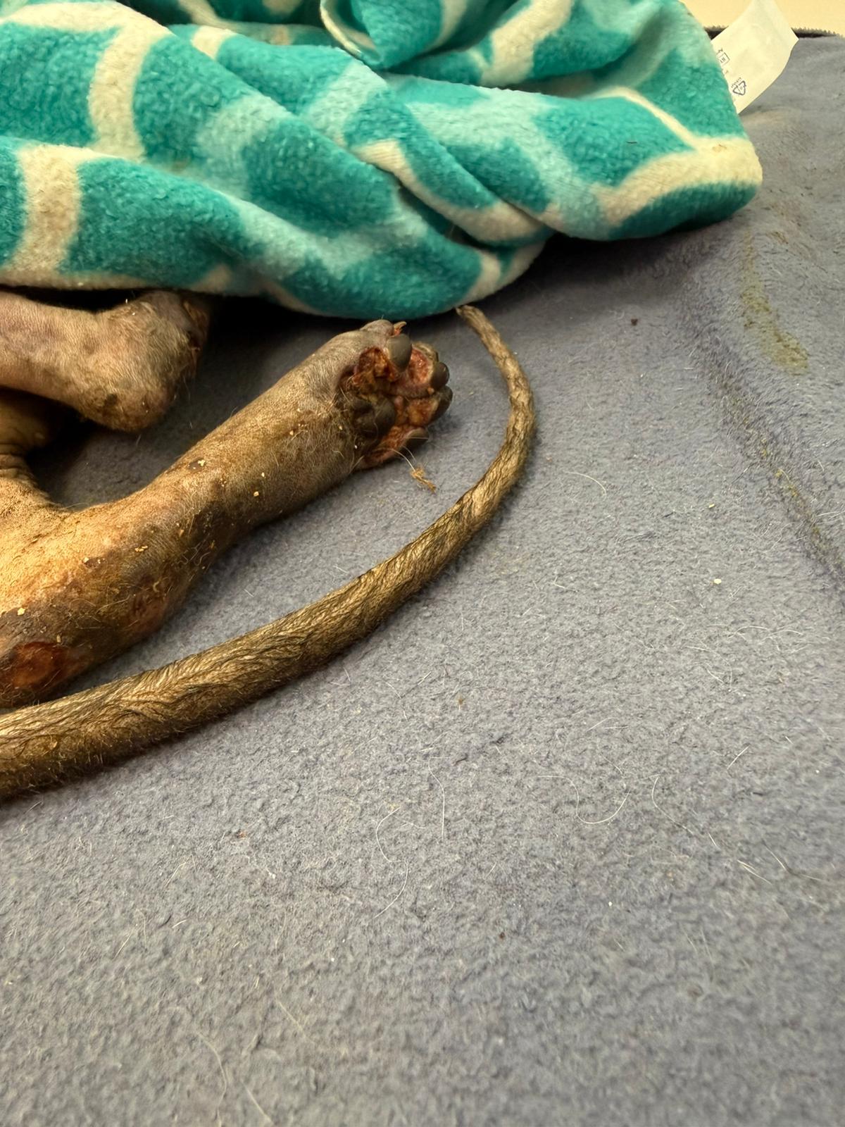 Został przyjęty na oddział zakaźny i objęty izolacją. Ma założony wenflon, otrzymuje intensywną płynoterapię, leki i stały nadzór. Lekarze zajmują się także leczeniem zmian na łapach, oczyszczaniem i terapią miejscową, aby zapobiec powikłaniom.