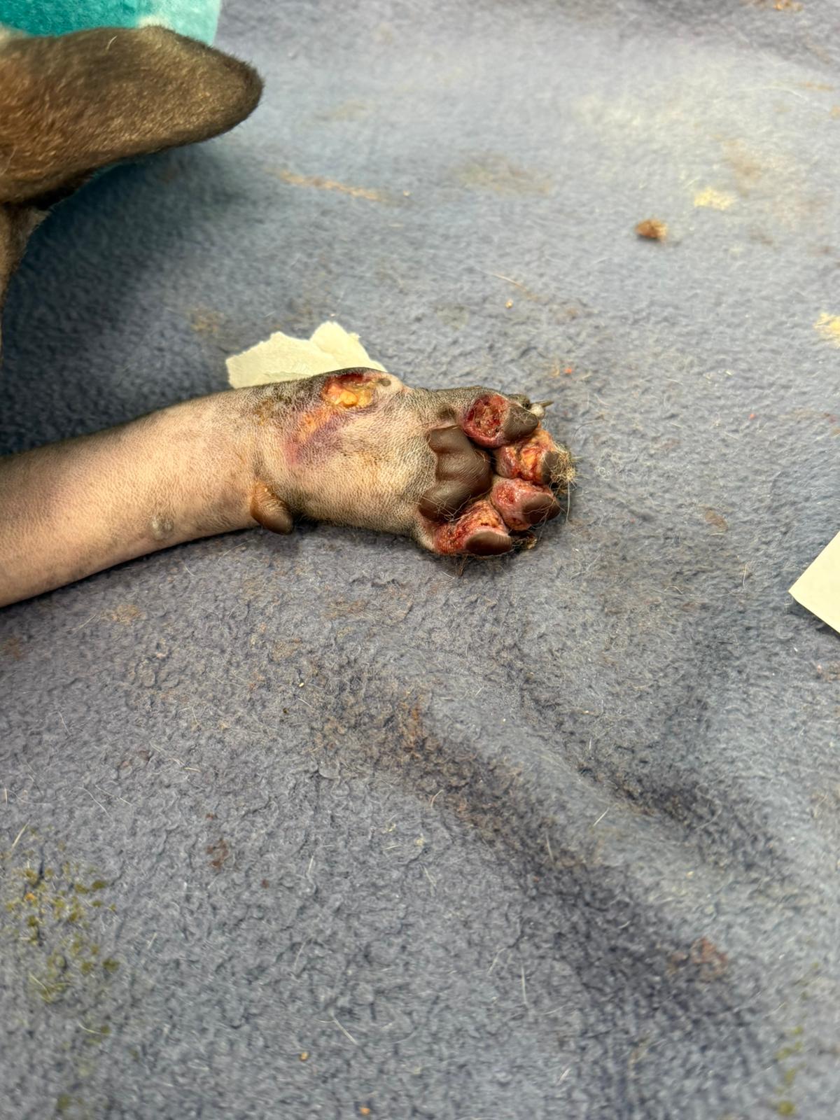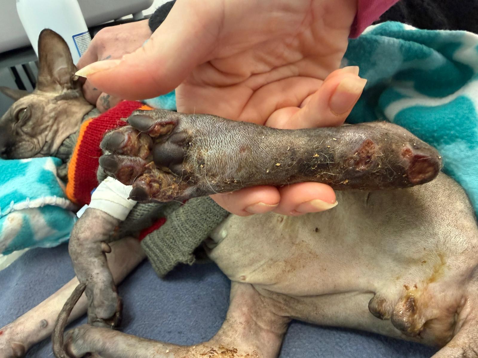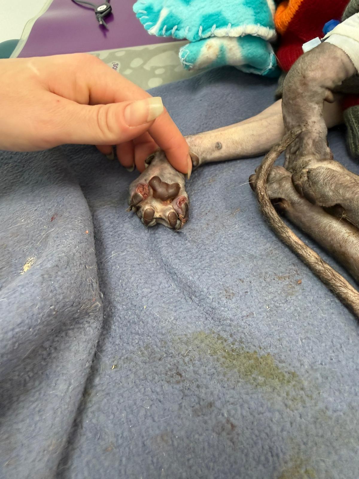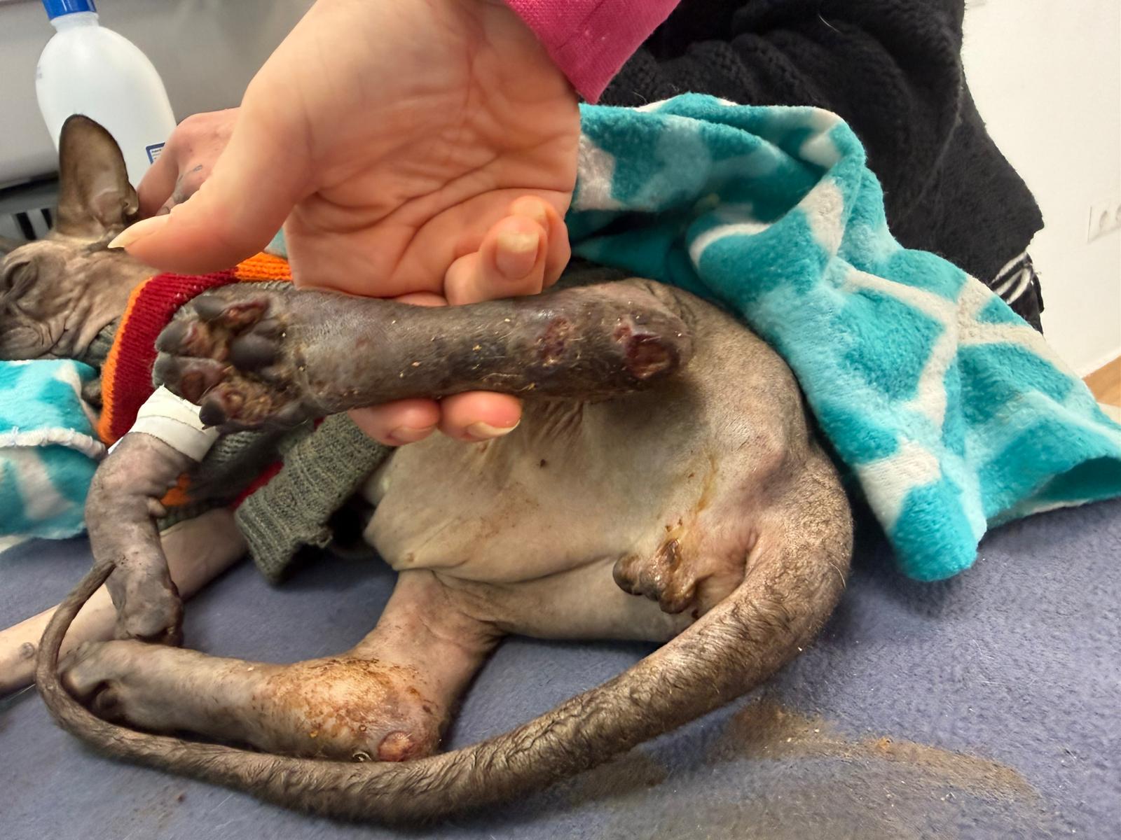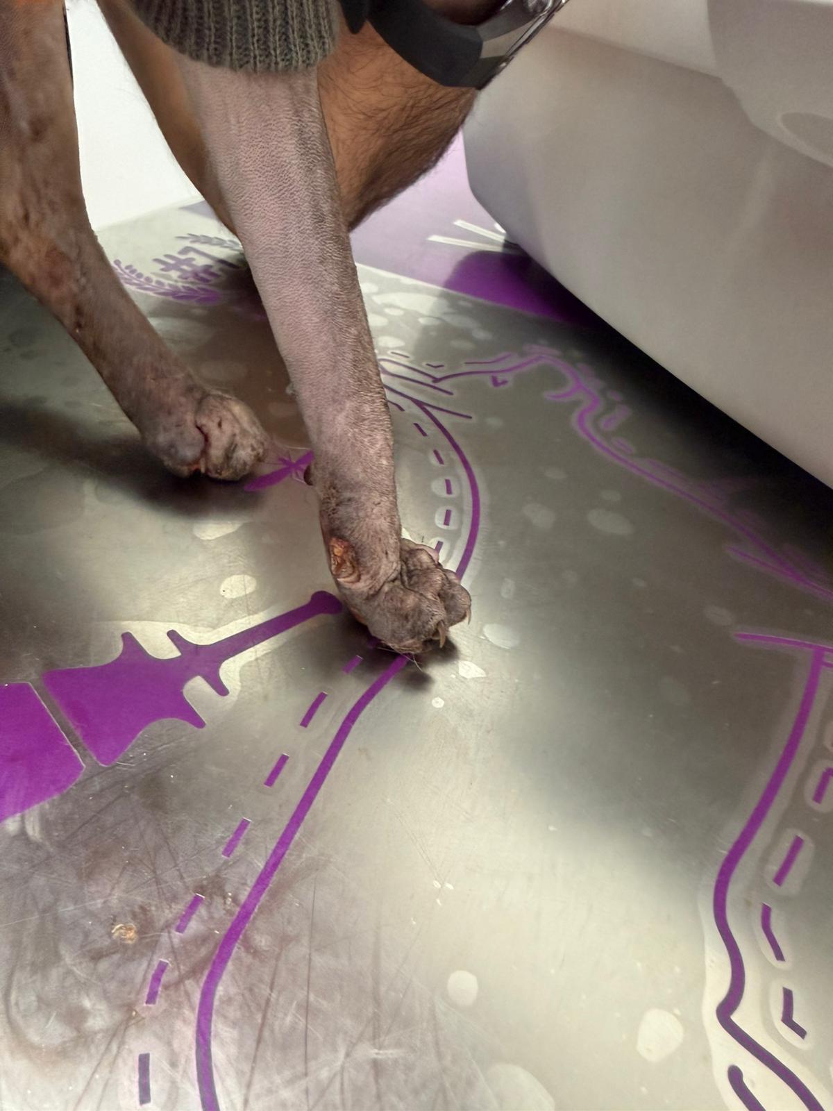 Został przyjęty na oddział zakaźny i objęty izolacją. Ma założony wenflon, otrzymuje intensywną płynoterapię, leki i stały nadzór. Lekarze zajmują się także leczeniem zmian na łapach, oczyszczaniem i terapią miejscową, aby zapobiec powikłaniom.