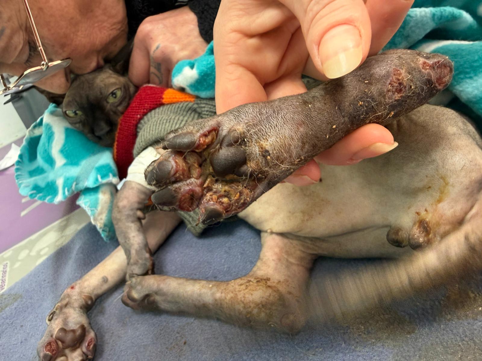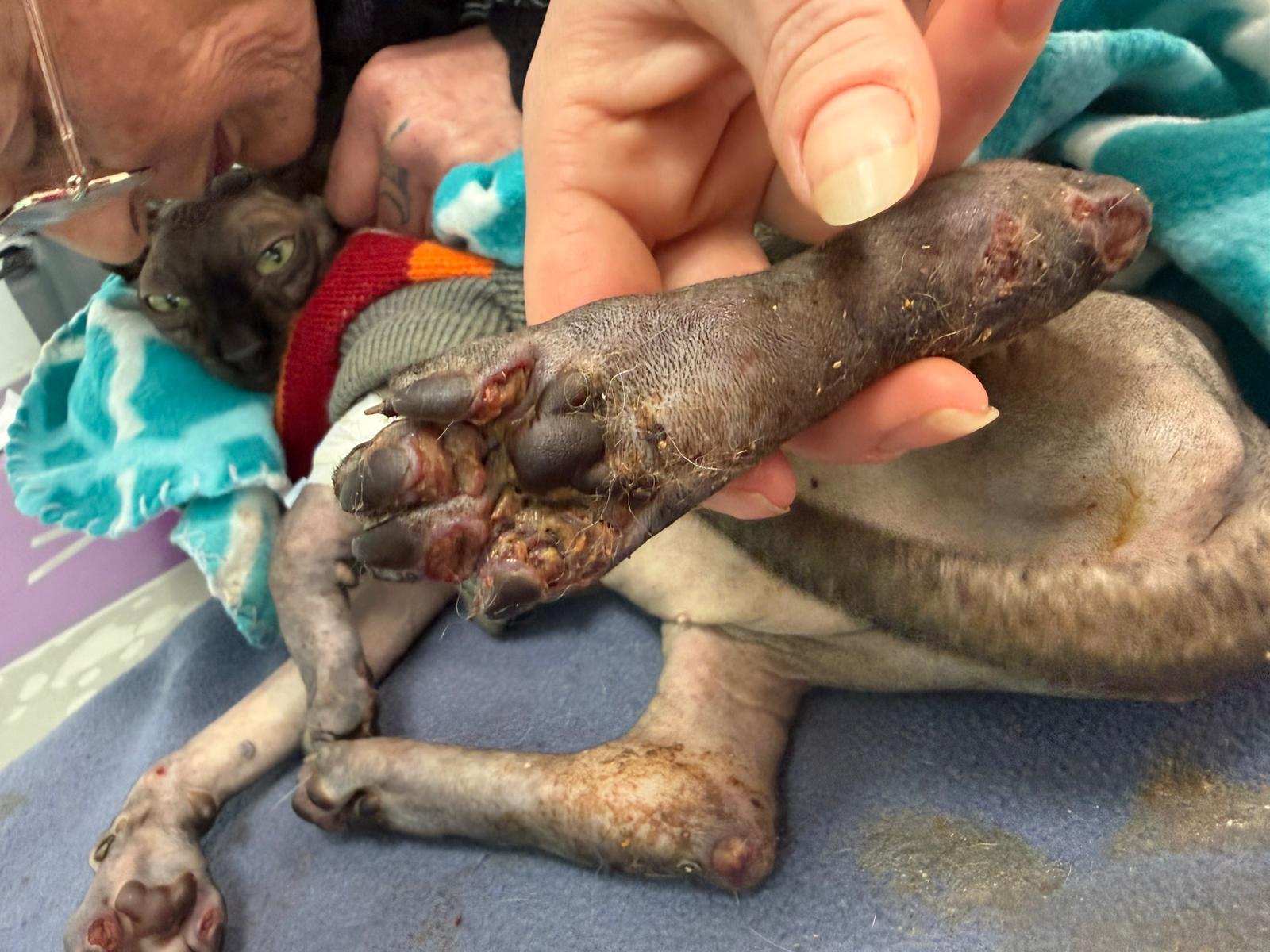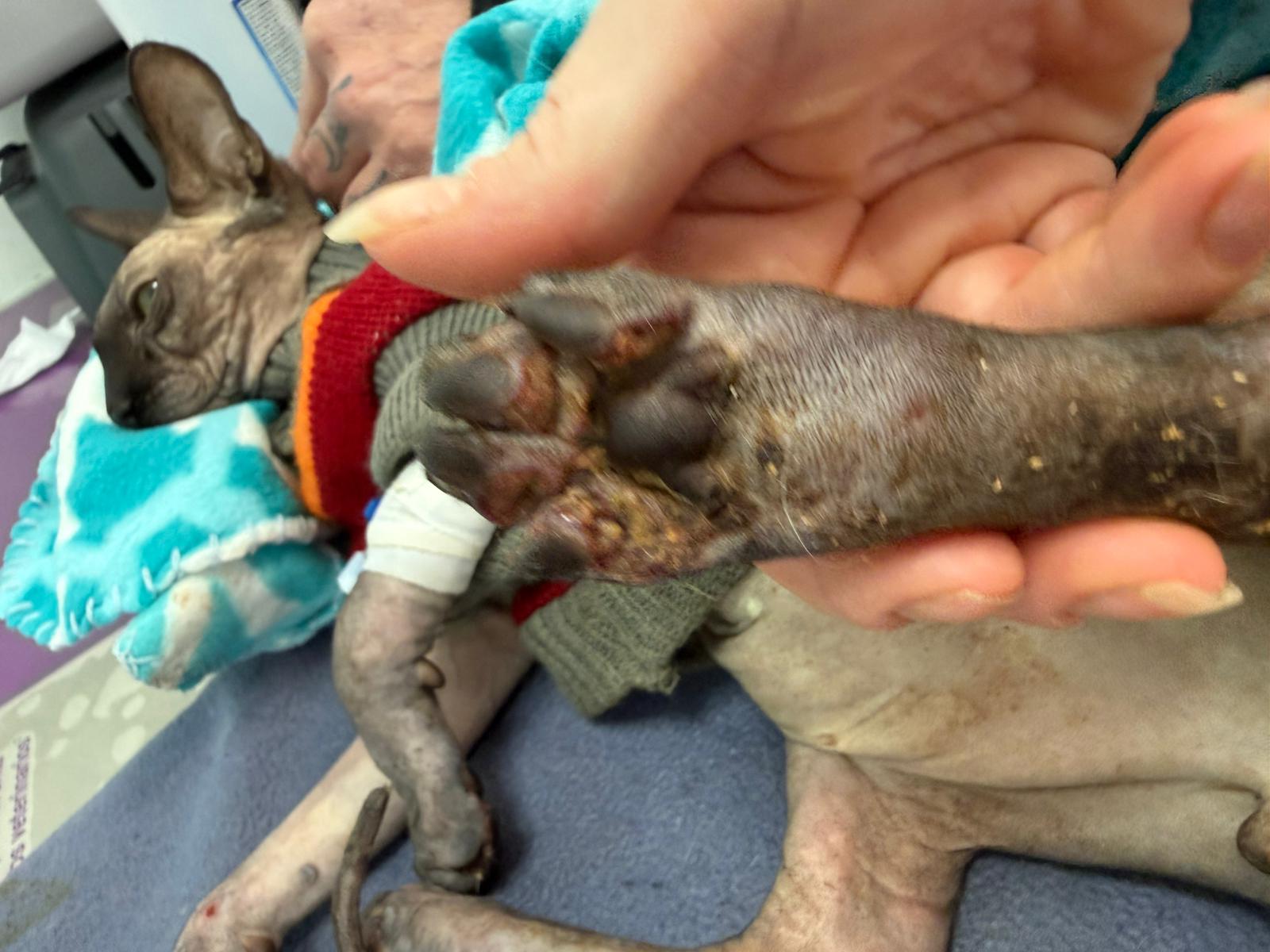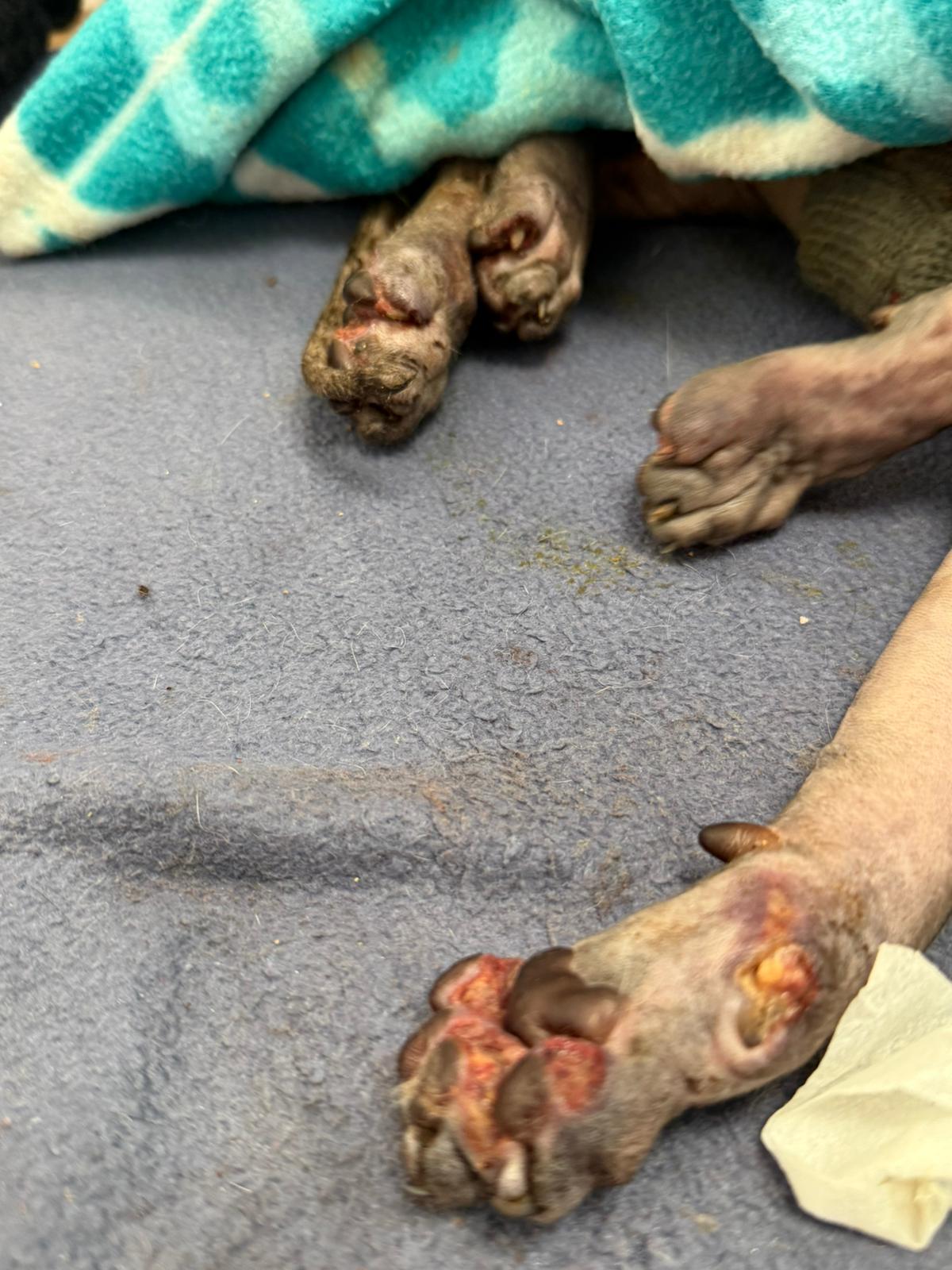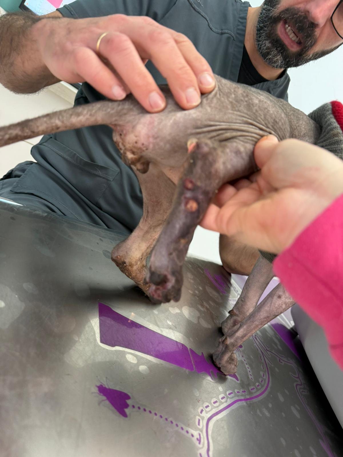 Został przyjęty na oddział zakaźny i objęty izolacją. Ma założony wenflon, otrzymuje intensywną płynoterapię, leki i stały nadzór. Lekarze zajmują się także leczeniem zmian na łapach, oczyszczaniem i terapią miejscową, aby zapobiec powikłaniom.