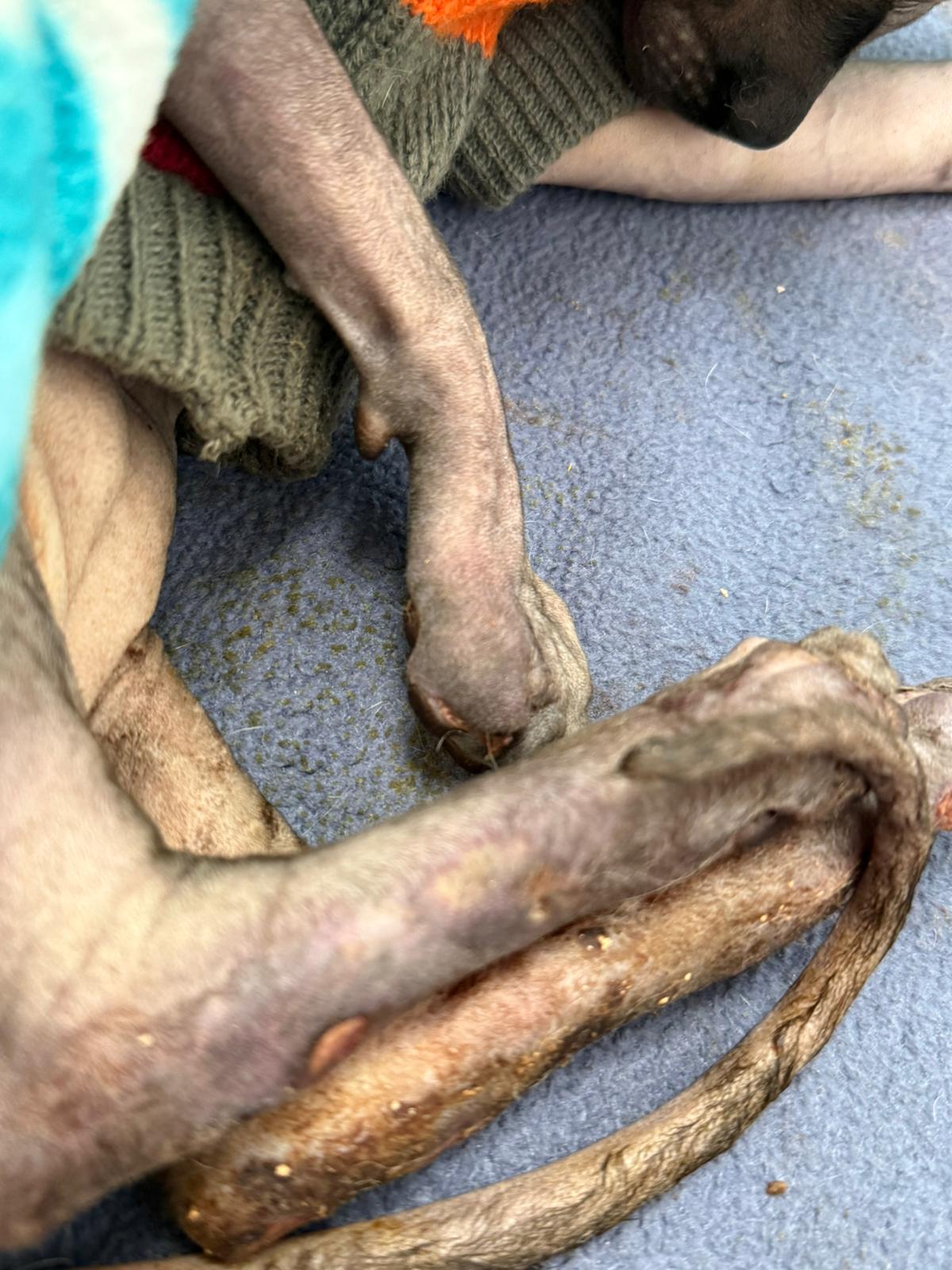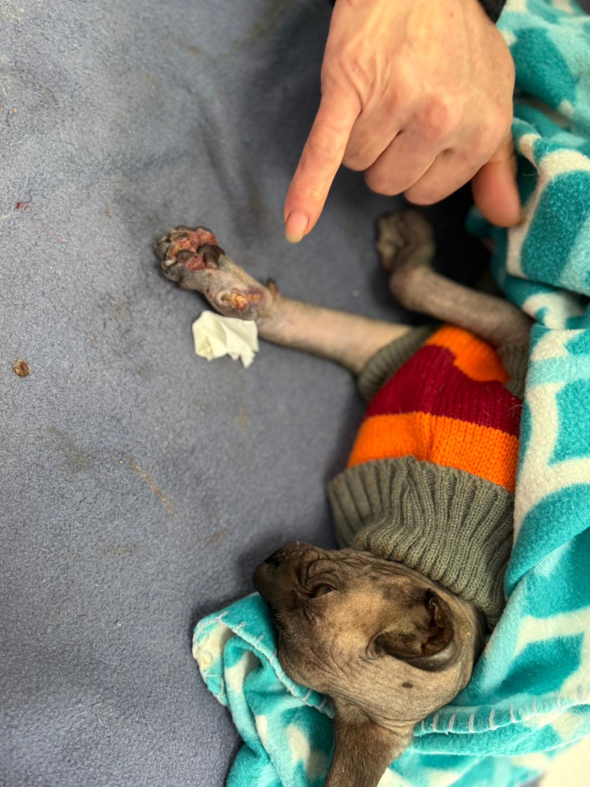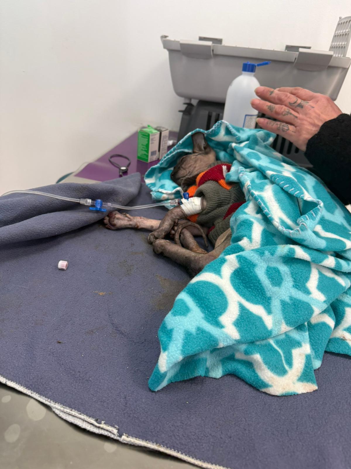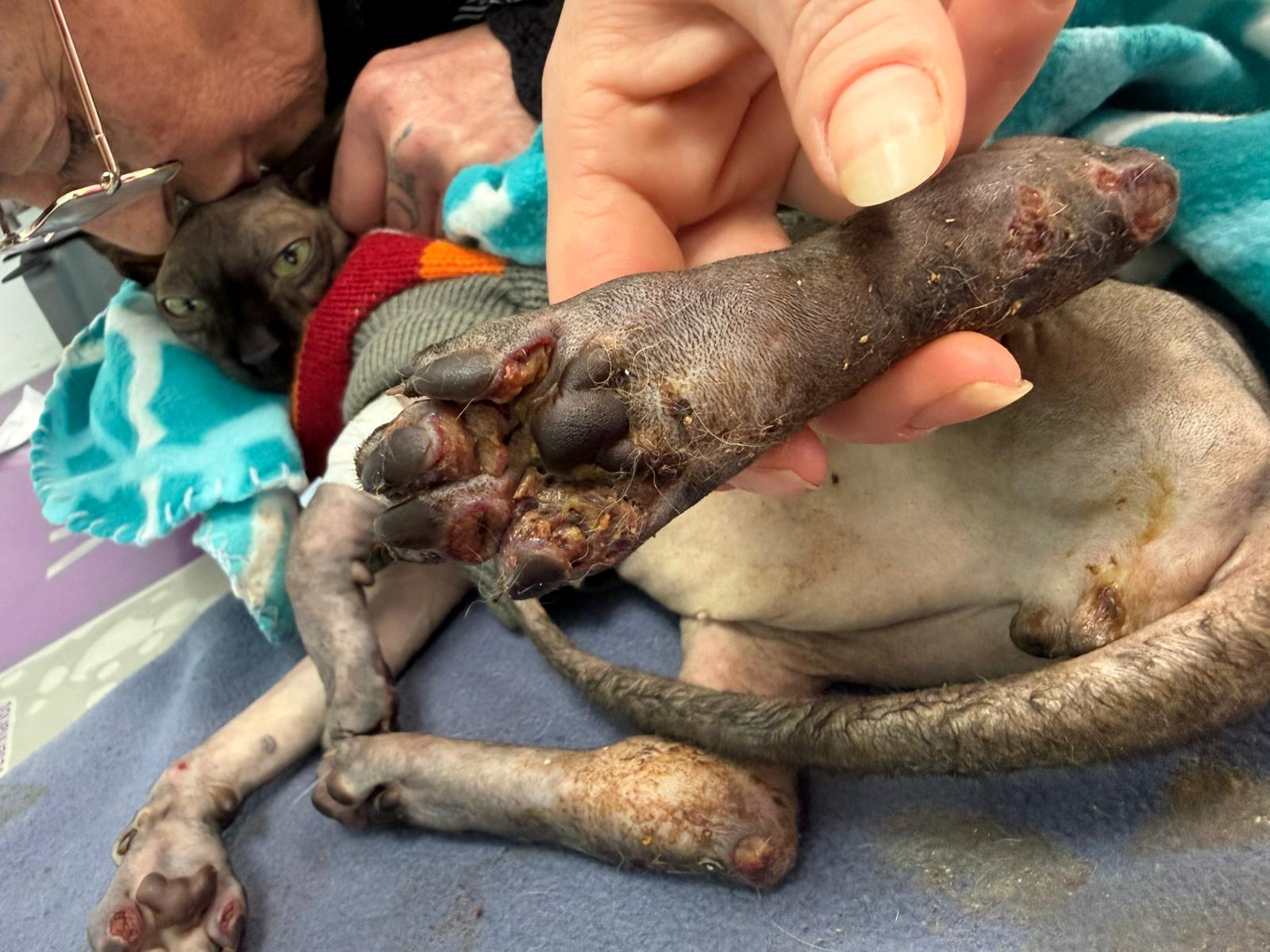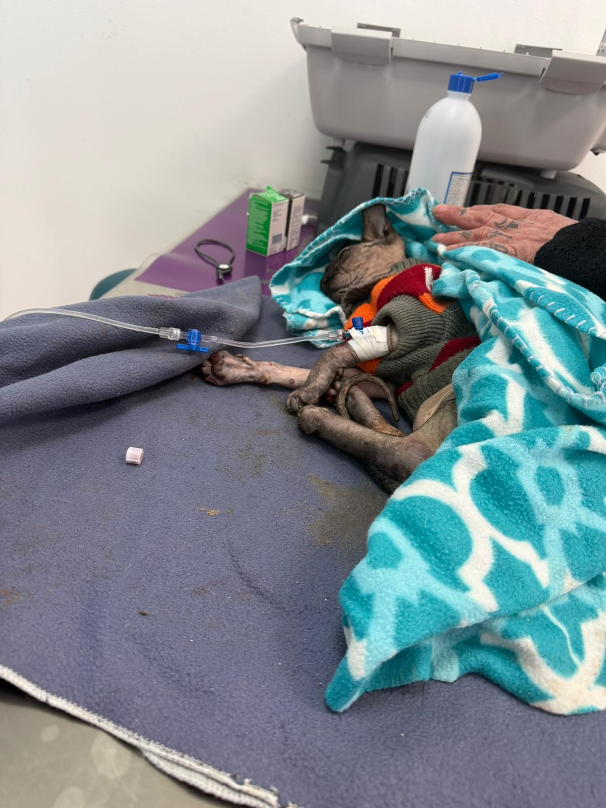 Został przyjęty na oddział zakaźny i objęty izolacją. Ma założony wenflon, otrzymuje intensywną płynoterapię, leki i stały nadzór. Lekarze zajmują się także leczeniem zmian na łapach, oczyszczaniem i terapią miejscową, aby zapobiec powikłaniom.