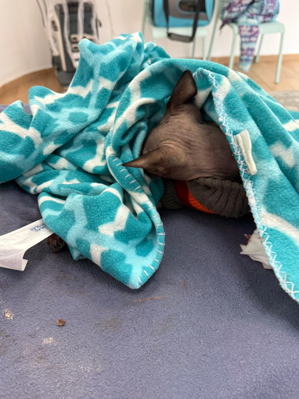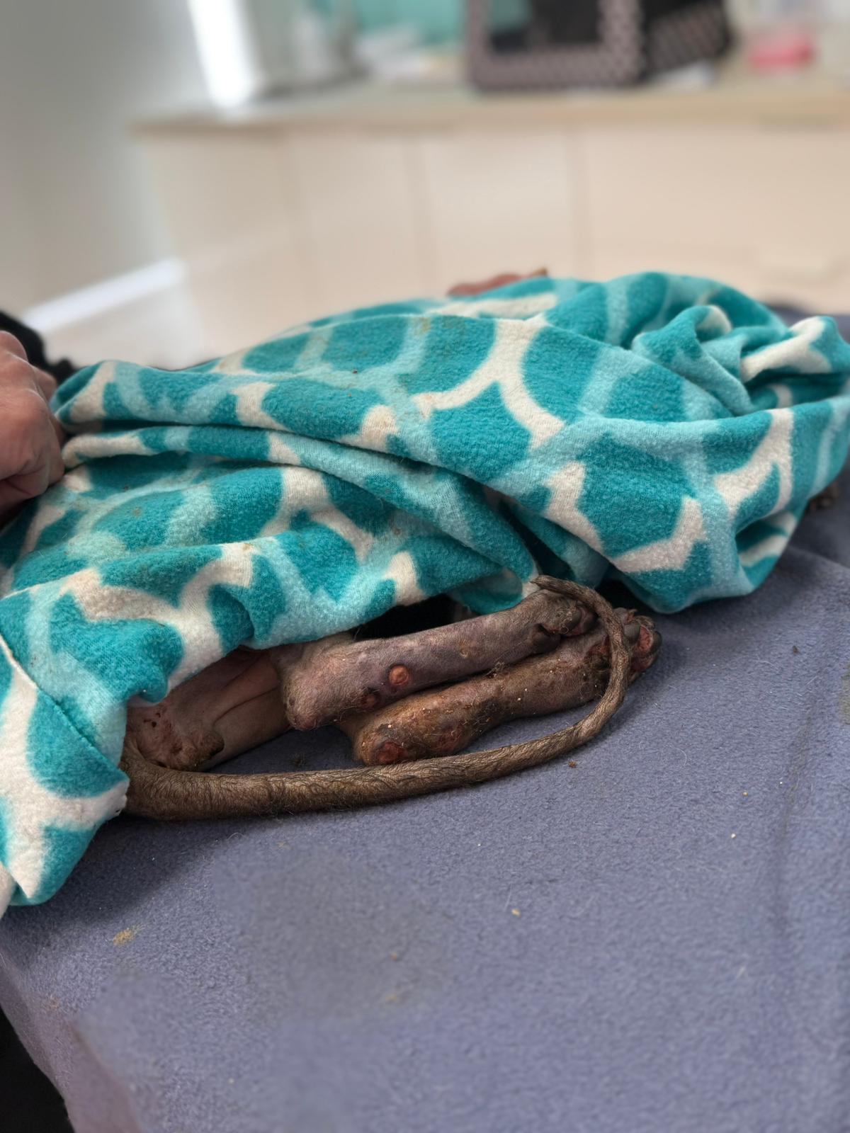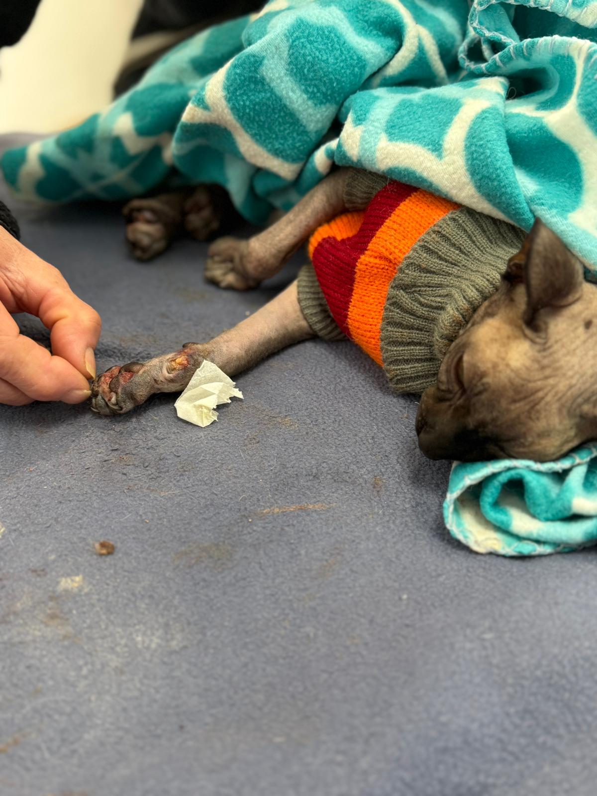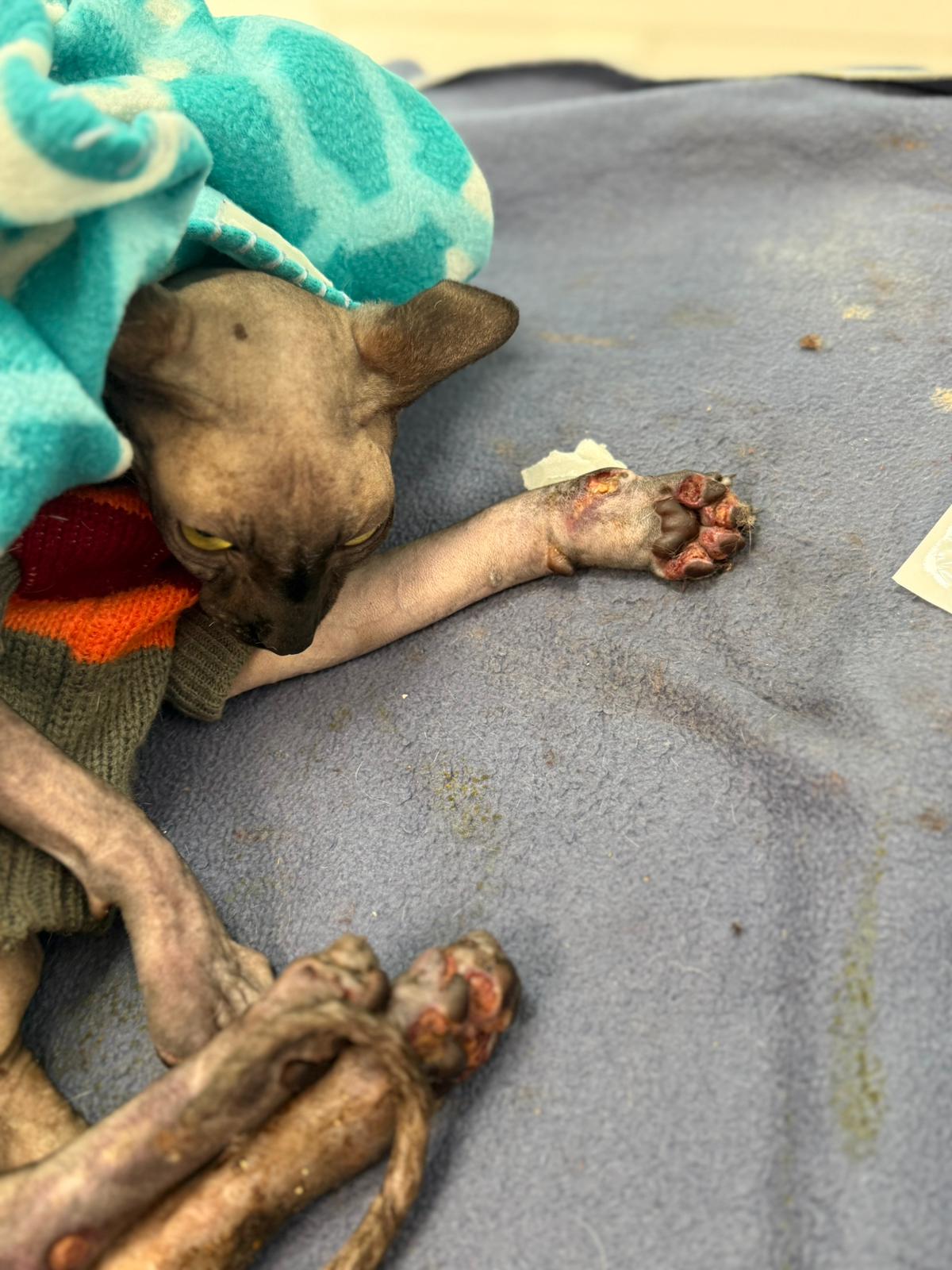 Został przyjęty na oddział zakaźny i objęty izolacją. Ma założony wenflon, otrzymuje intensywną płynoterapię, leki i stały nadzór. Lekarze zajmują się także leczeniem zmian na łapach, oczyszczaniem i terapią miejscową, aby zapobiec powikłaniom.