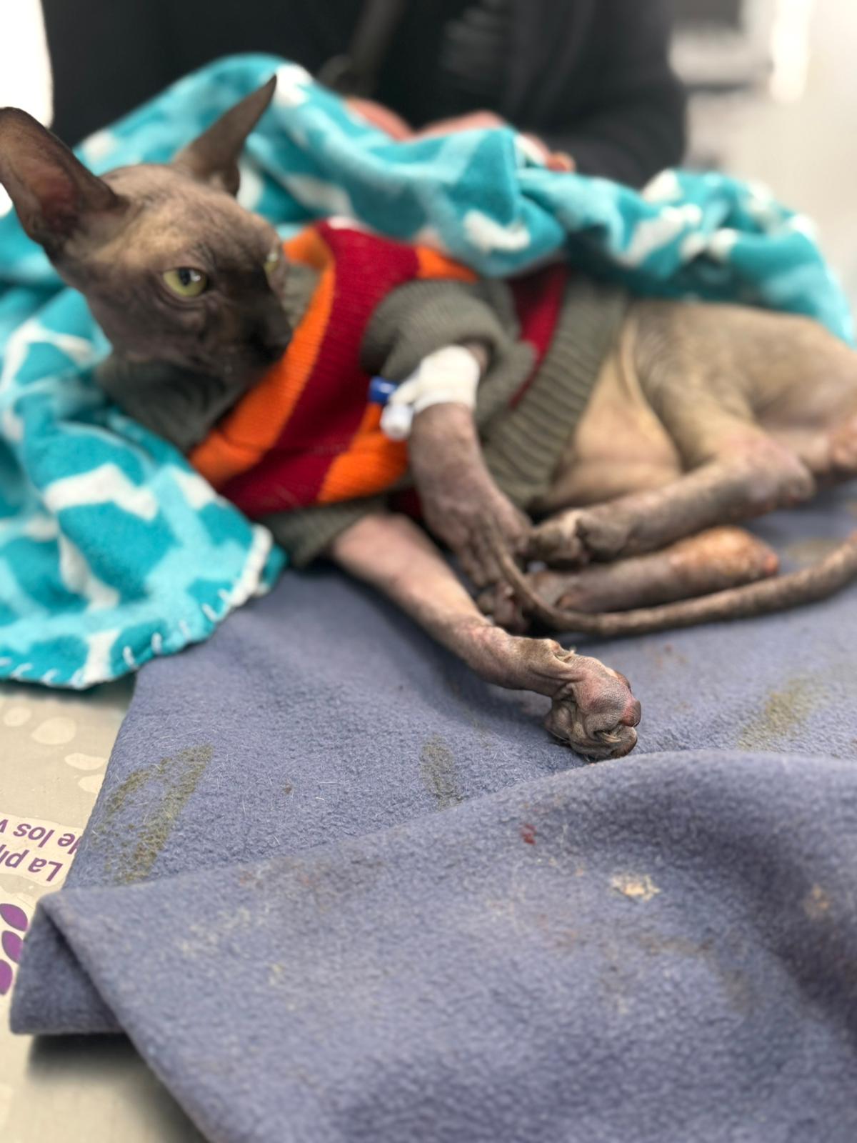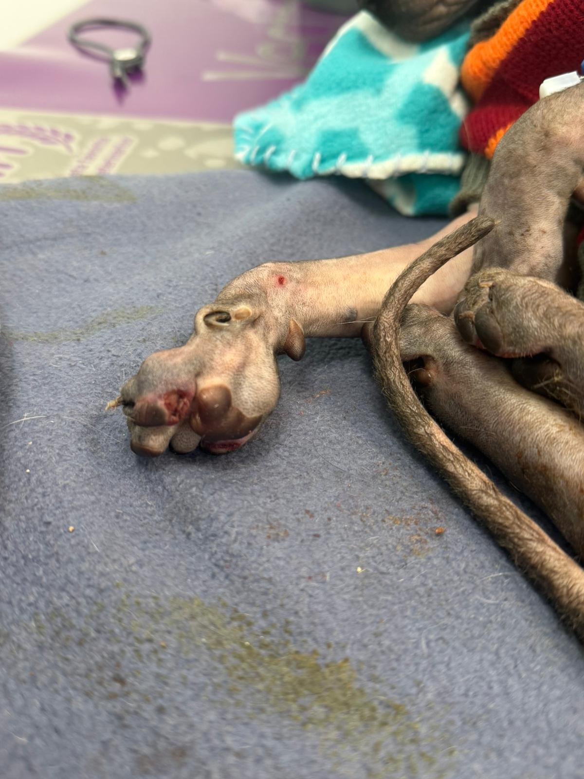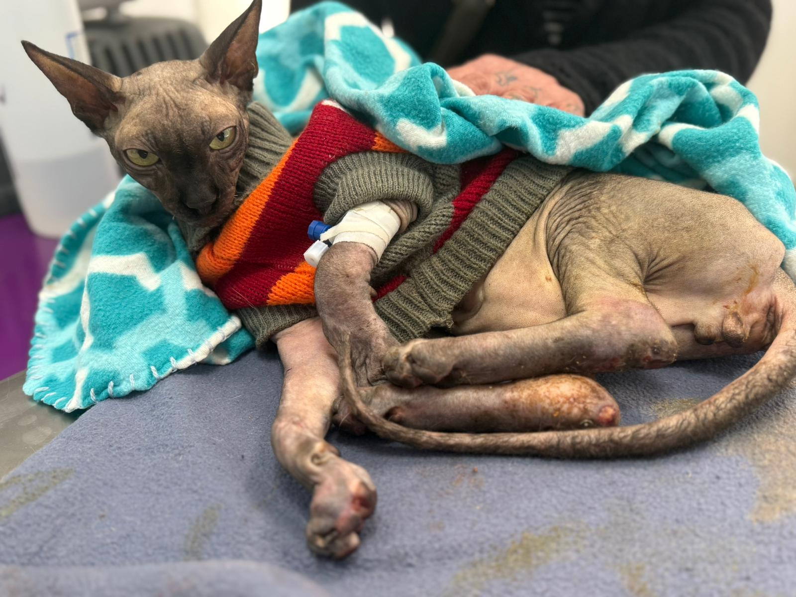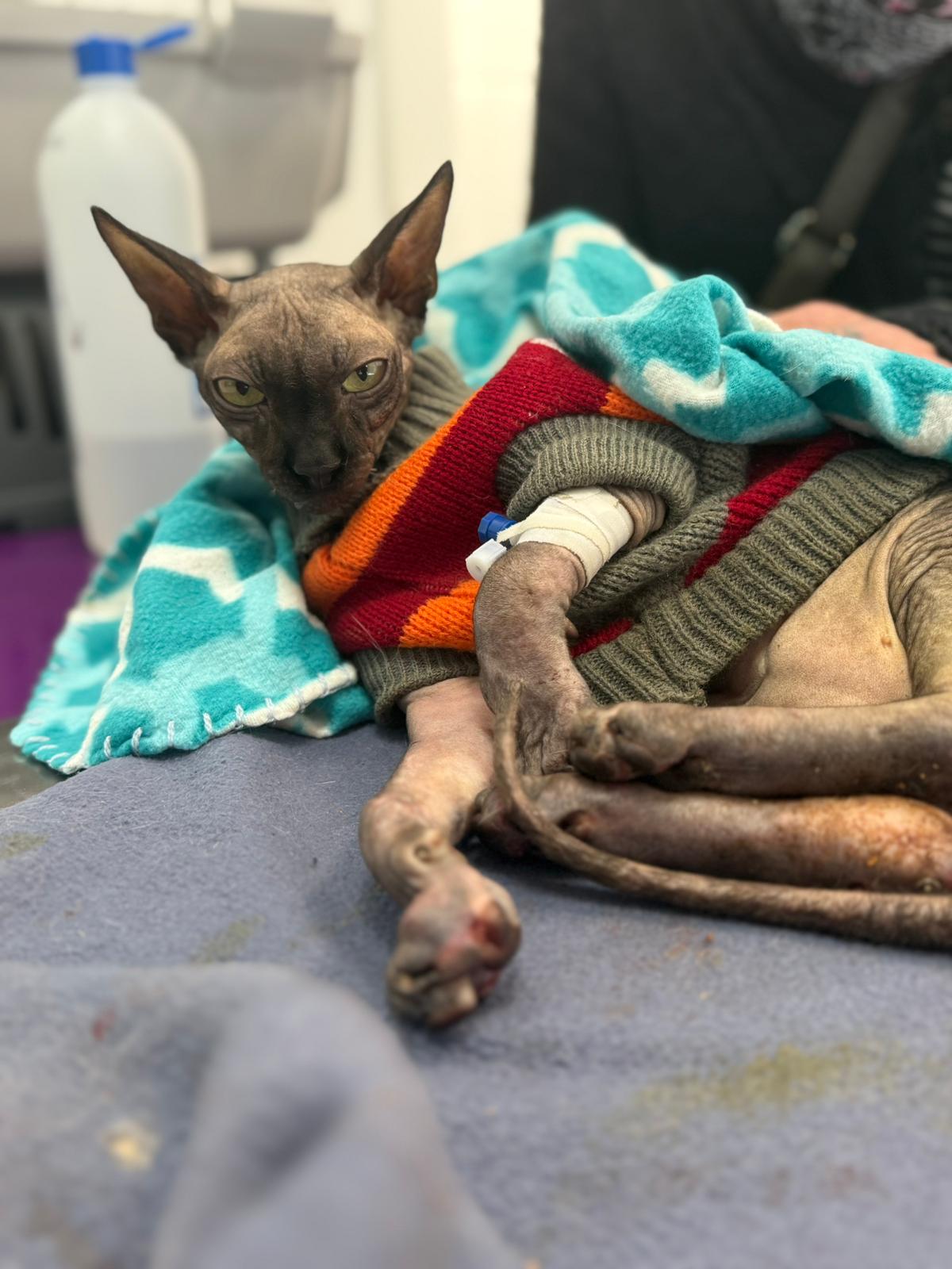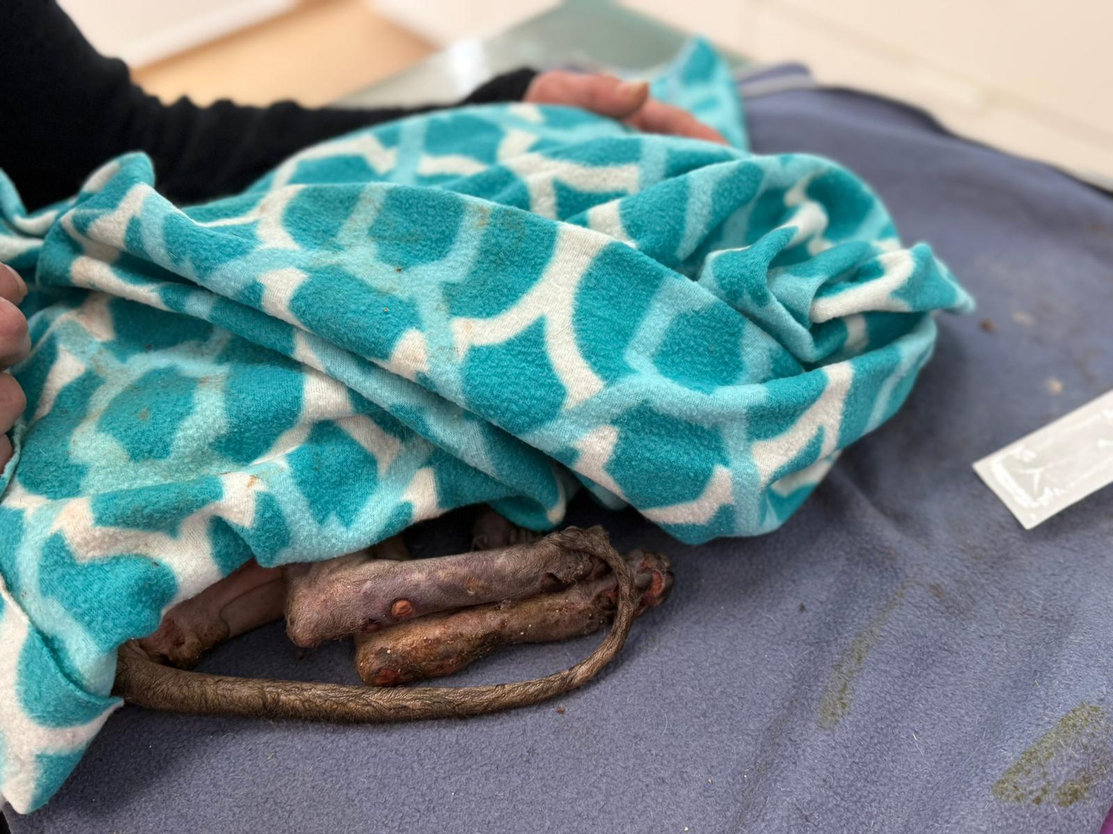 Został przyjęty na oddział zakaźny i objęty izolacją. Ma założony wenflon, otrzymuje intensywną płynoterapię, leki i stały nadzór. Lekarze zajmują się także leczeniem zmian na łapach, oczyszczaniem i terapią miejscową, aby zapobiec powikłaniom.